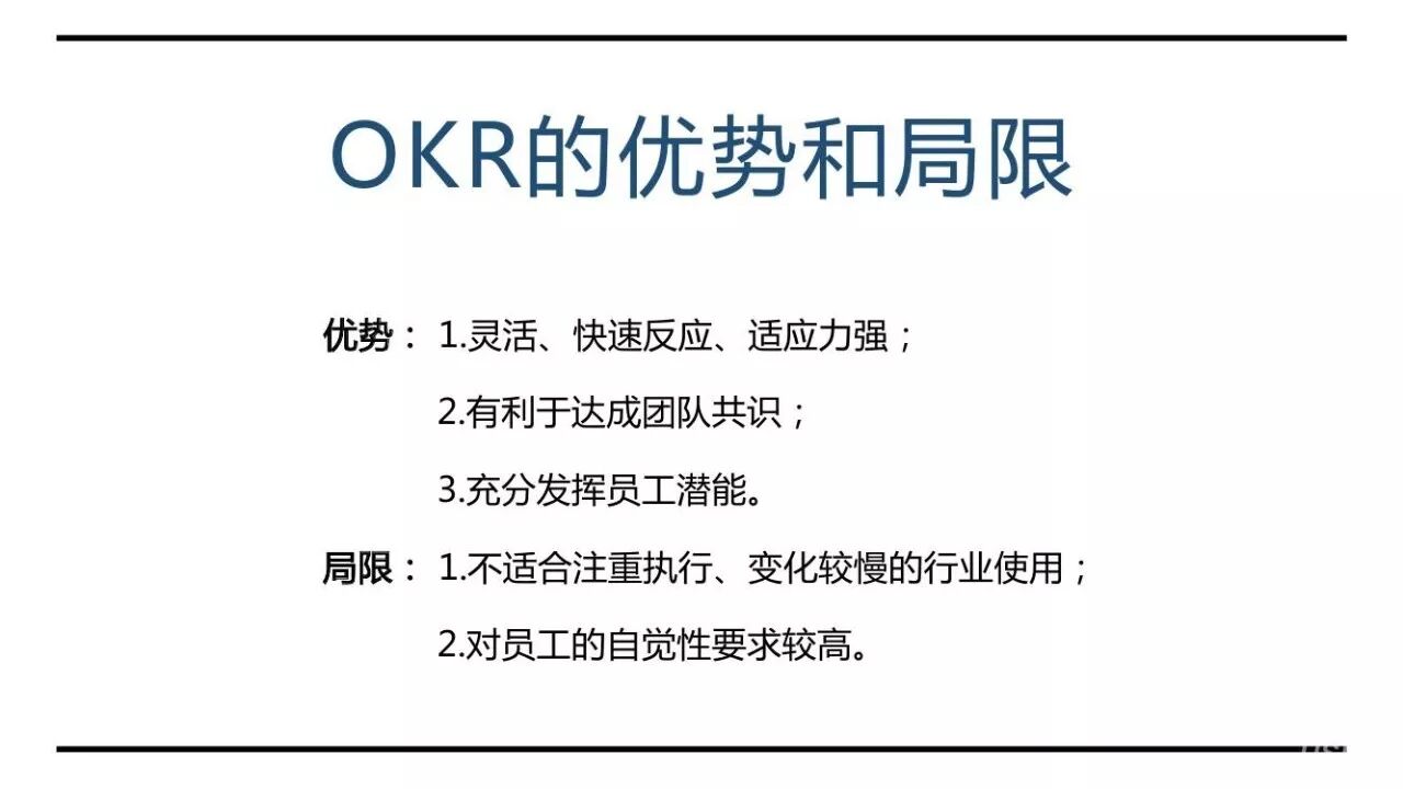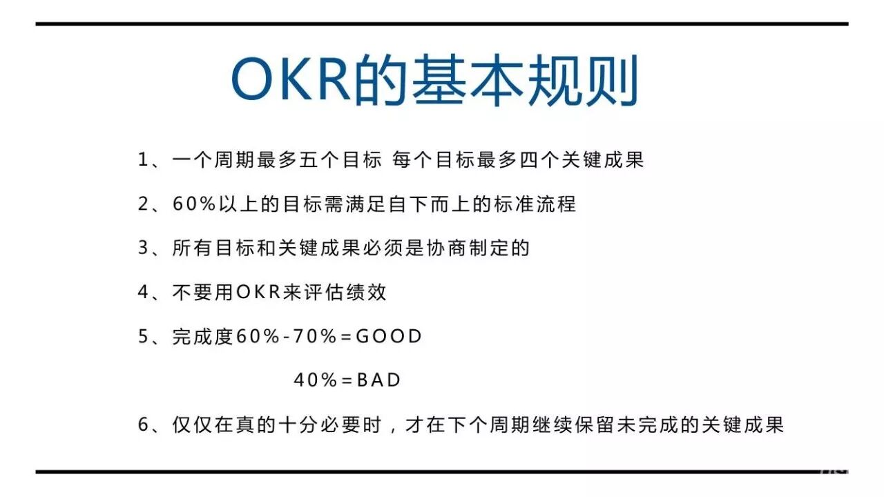 其实,在我工作这么多年来看,很少有公司把OKR这个概念执行的很好,很多公司就连KPI都没有设定执行好更不要谈OKR了,或许是我进的公司都非一线大公司吧,哈哈!努力奋斗中,希望有一天能在某个公司运用并参与到真正的OKR工作管理状态中去。